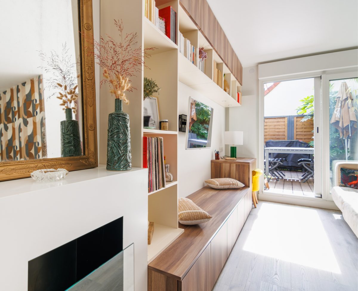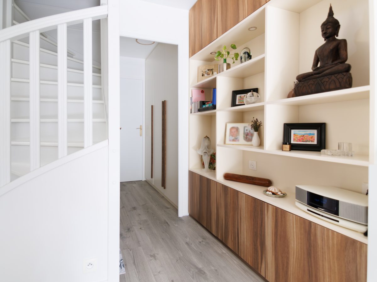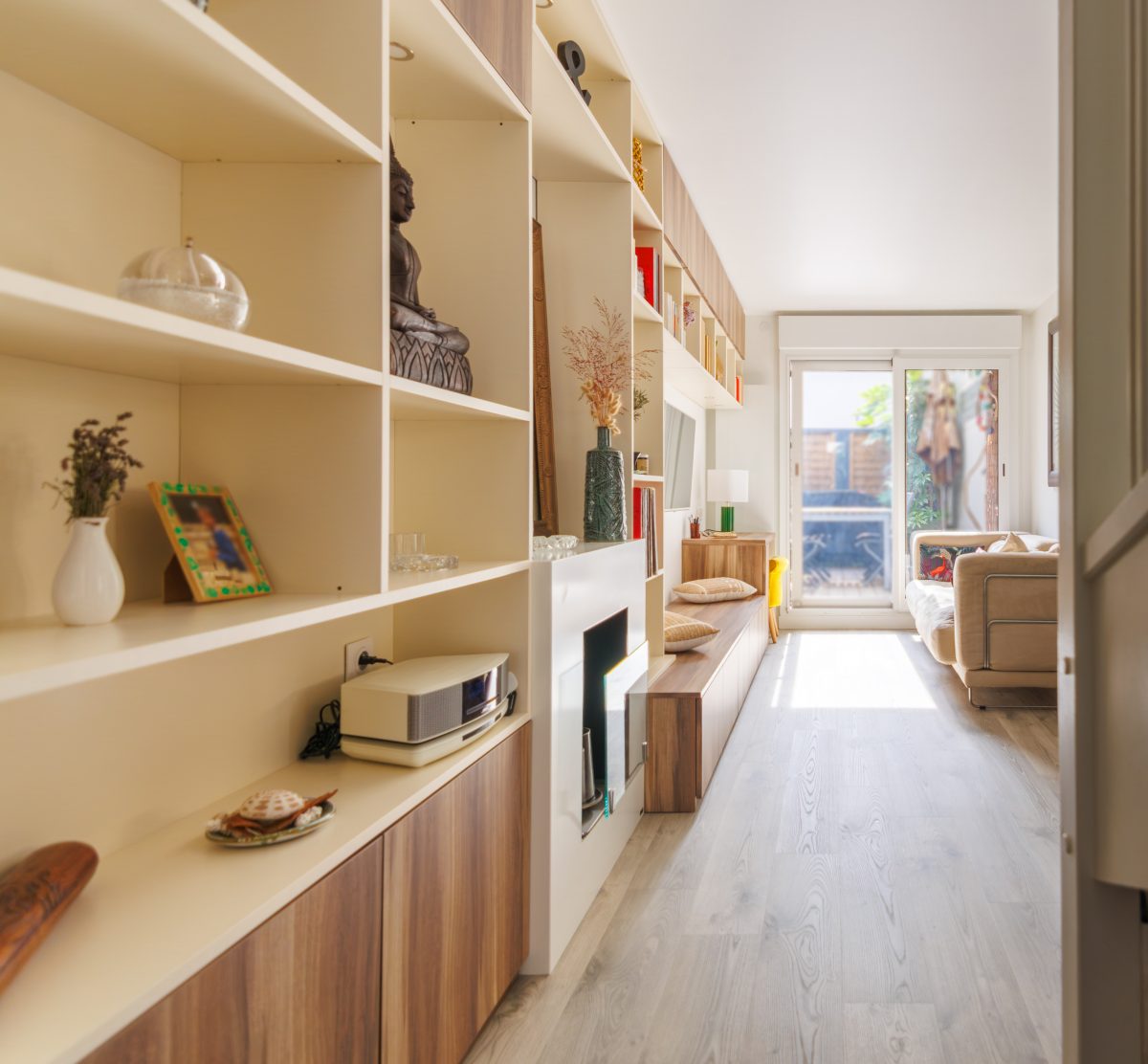 Suspendue au-dessus du salon, la bibliothèque se déploie comme un panorama intérieur. Ses lignes épurées dialoguent avec l’espace, offrant à la fois une mise en scène des livres et un banc de rangement intégré, pensé comme une assise conviviale. À la croisée de l’esthétique et de la fonctionnalité, ce projet transforme le mobilier en architecture du quotidien.