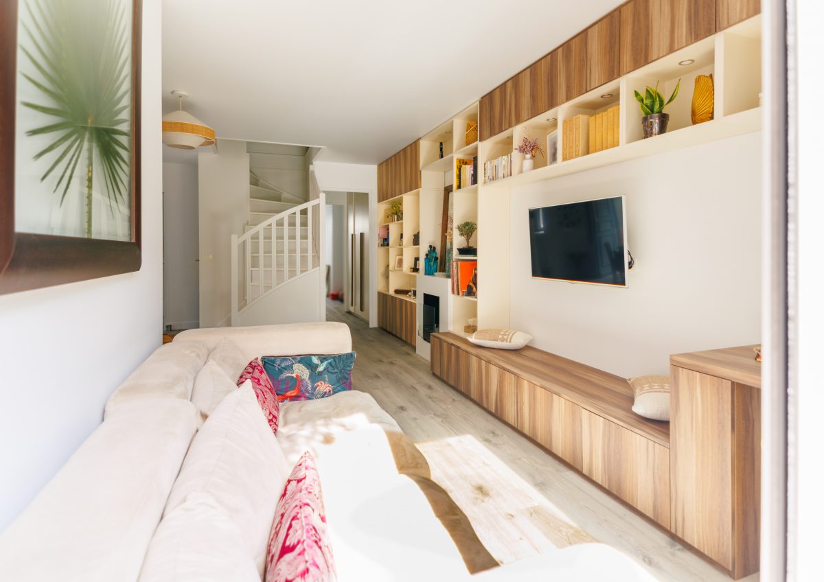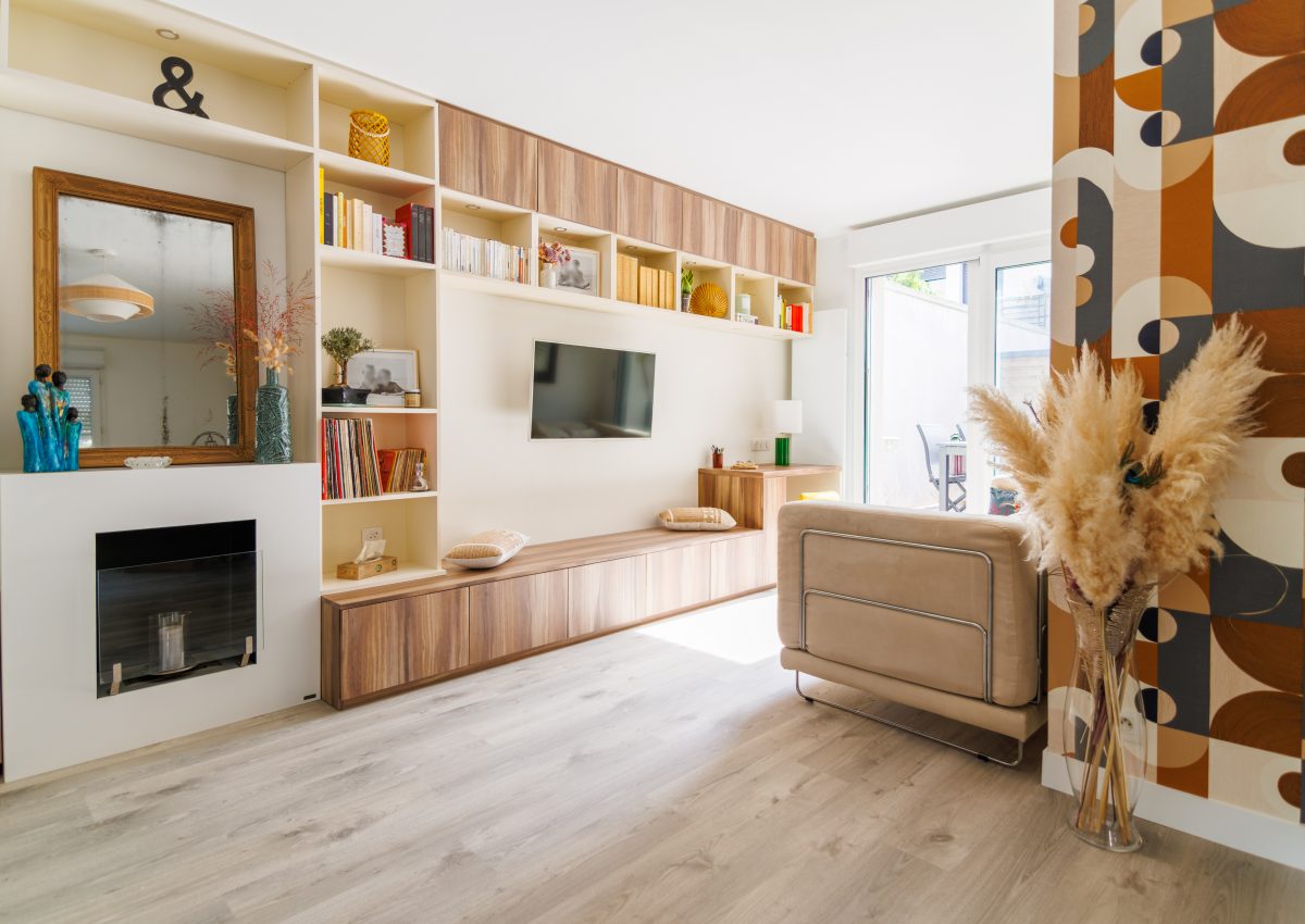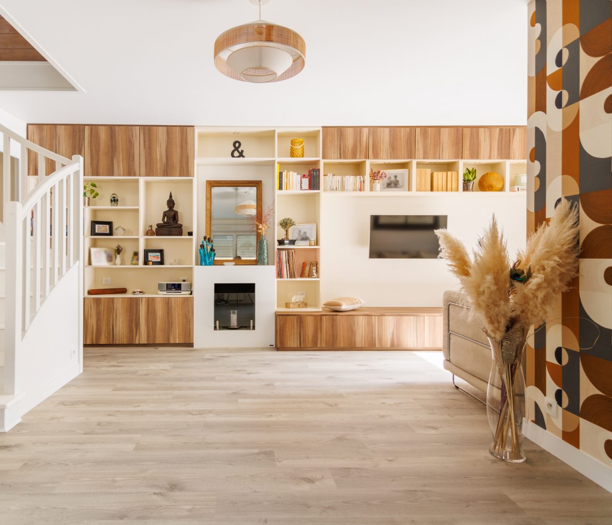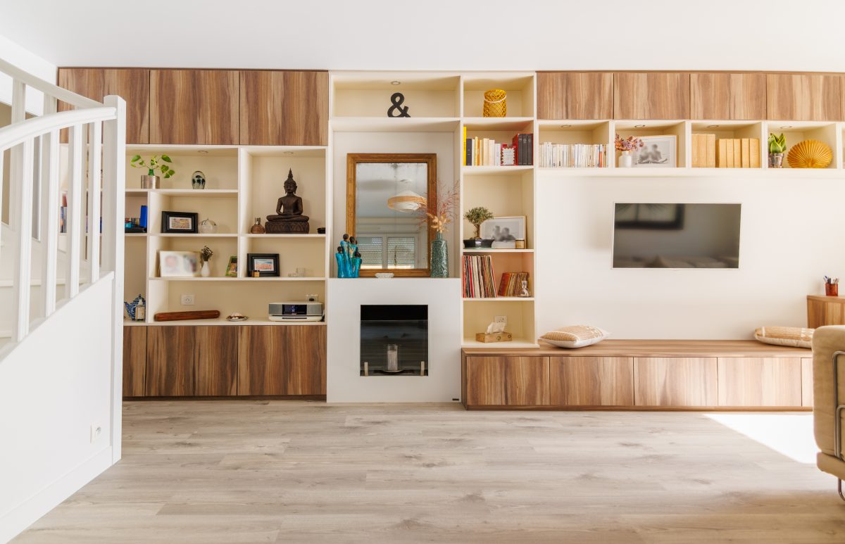Suspendue au-dessus du salon, la bibliothèque se déploie comme un panorama intérieur. Ses lignes épurées dialoguent avec l’espace, offrant à la fois une mise en scène des livres et un banc de rangement intégré, pensé comme une assise conviviale. À la croisée de l’esthétique et de la fonctionnalité, ce projet transforme le mobilier en architecture du quotidien.
