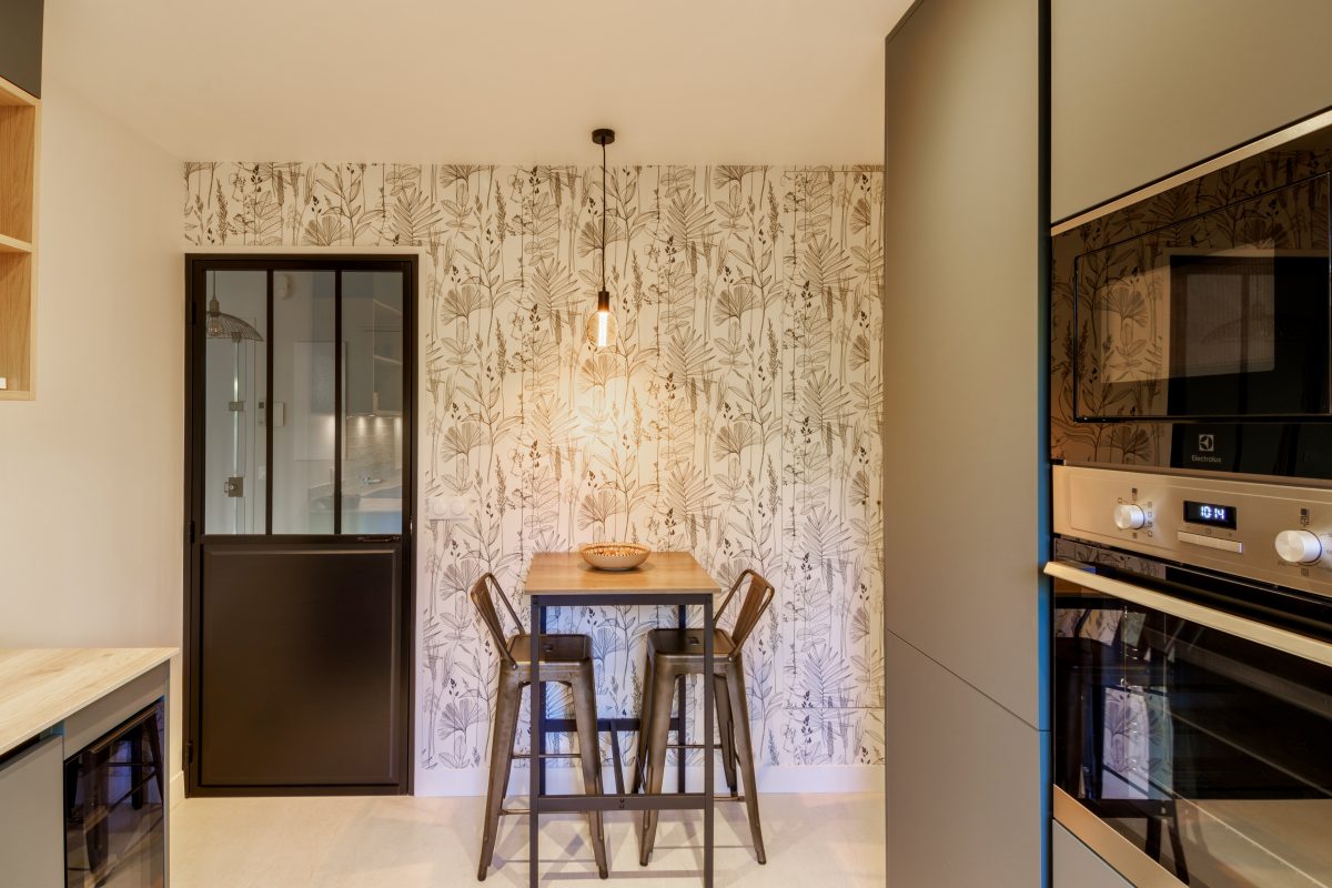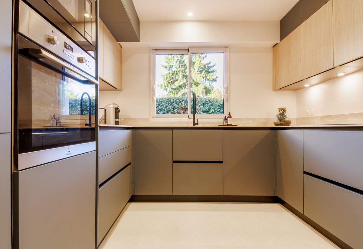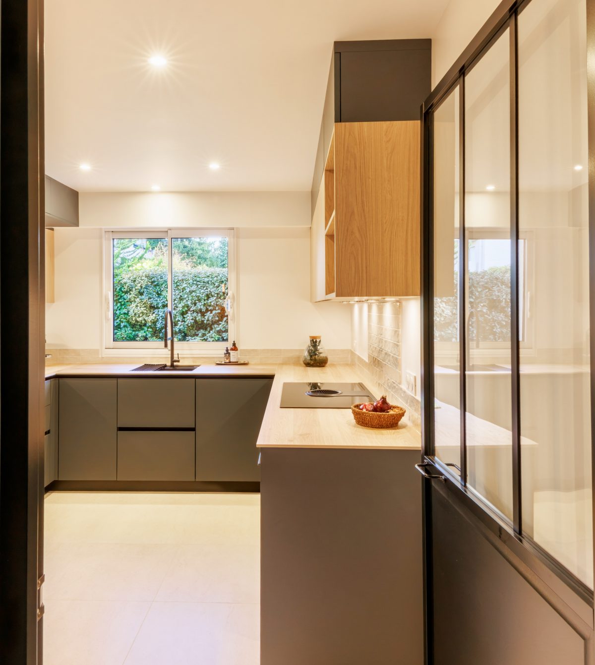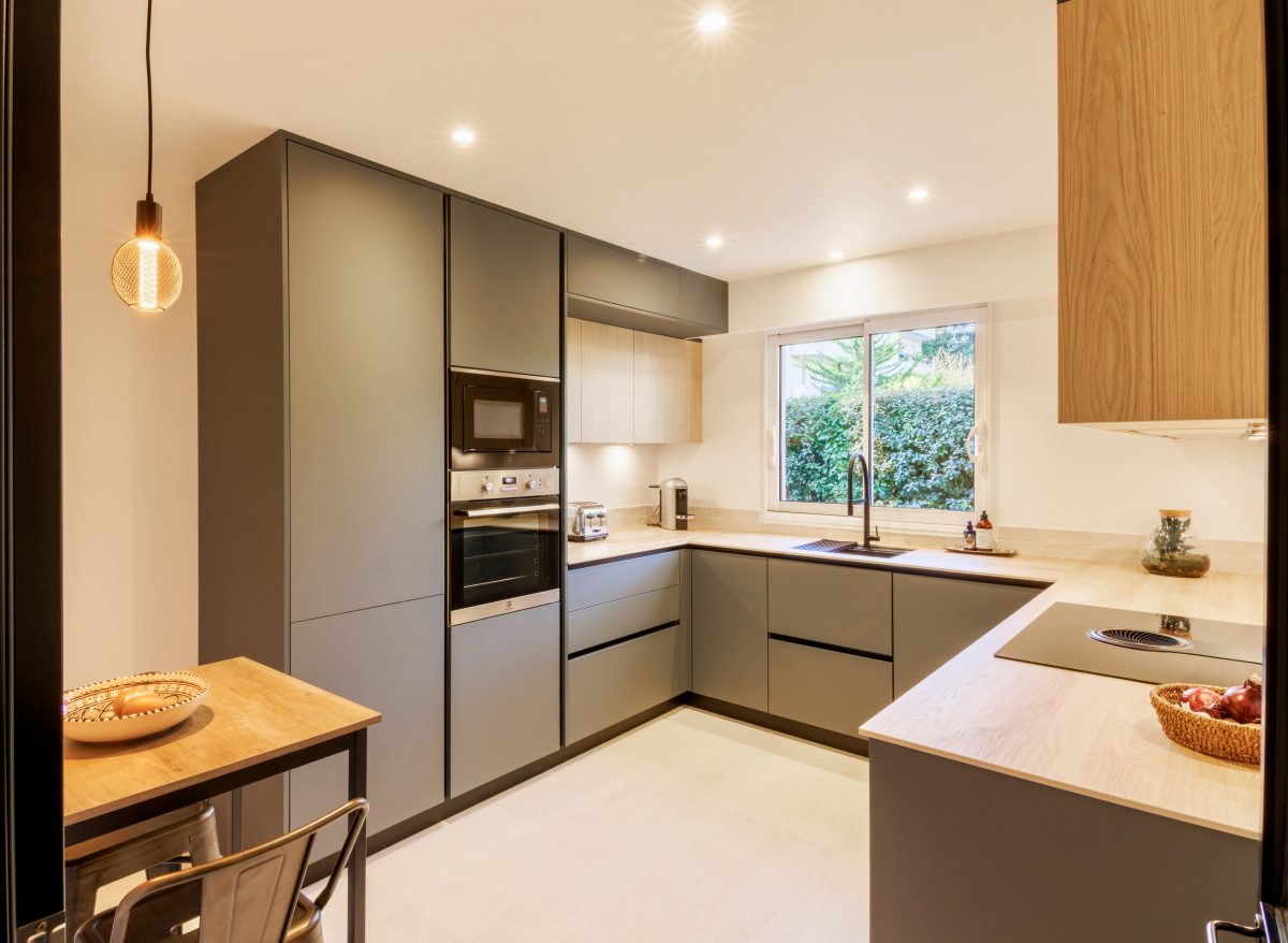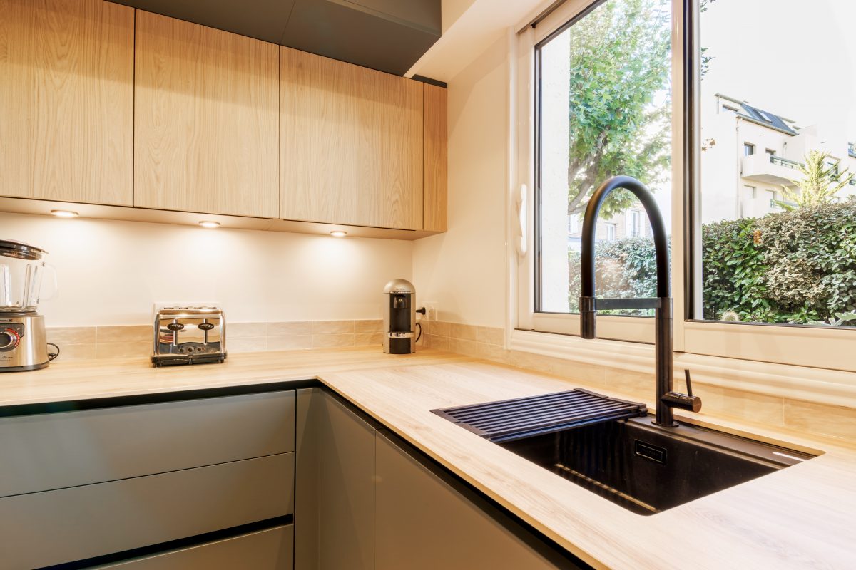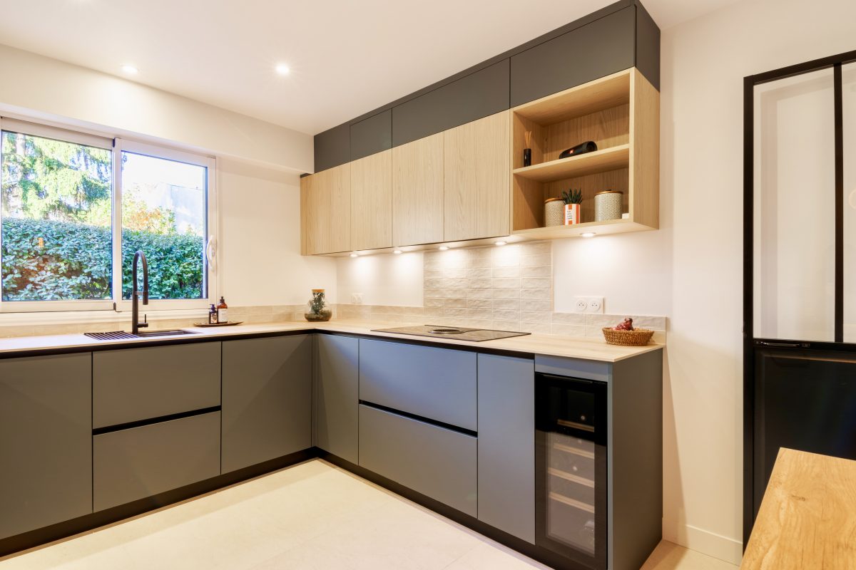 Les plans de travail en bois clair complètent harmonieusement l’ensemble pour un espace à la fois chaleureux et contemporain.