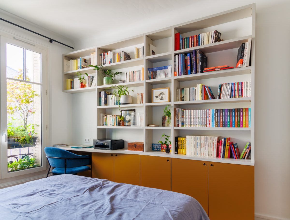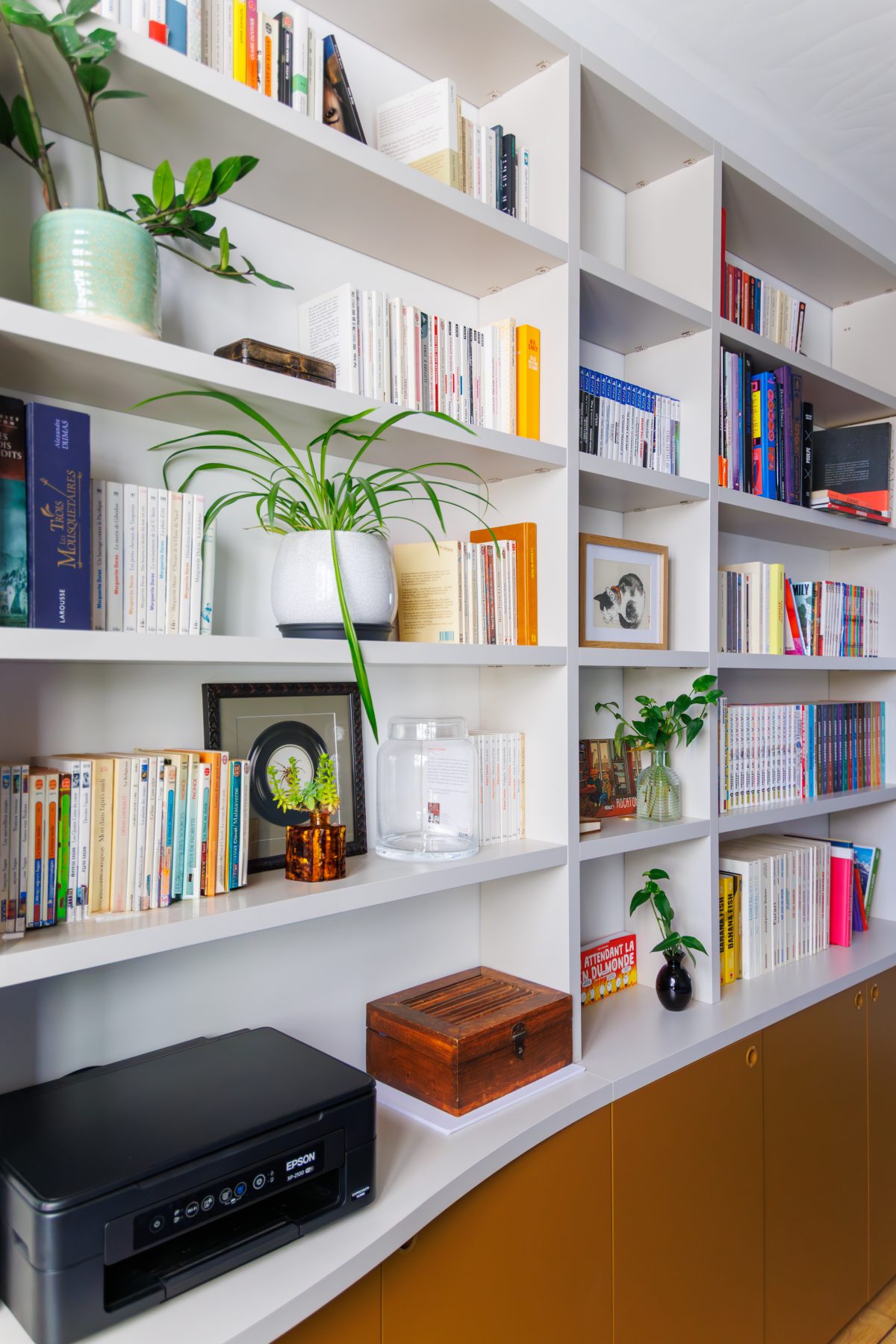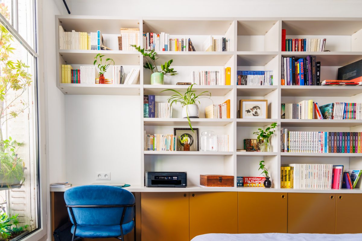 Un espace pensé pour mêler esthétique et fonctionnalité : bibliothèque sur mesure, lumière naturelle, plantes vertes et touches de couleurs.