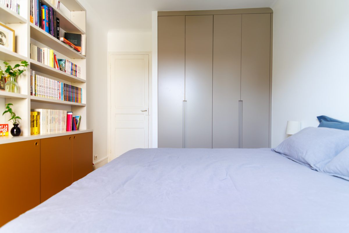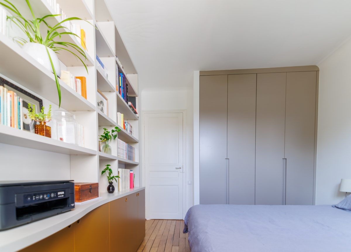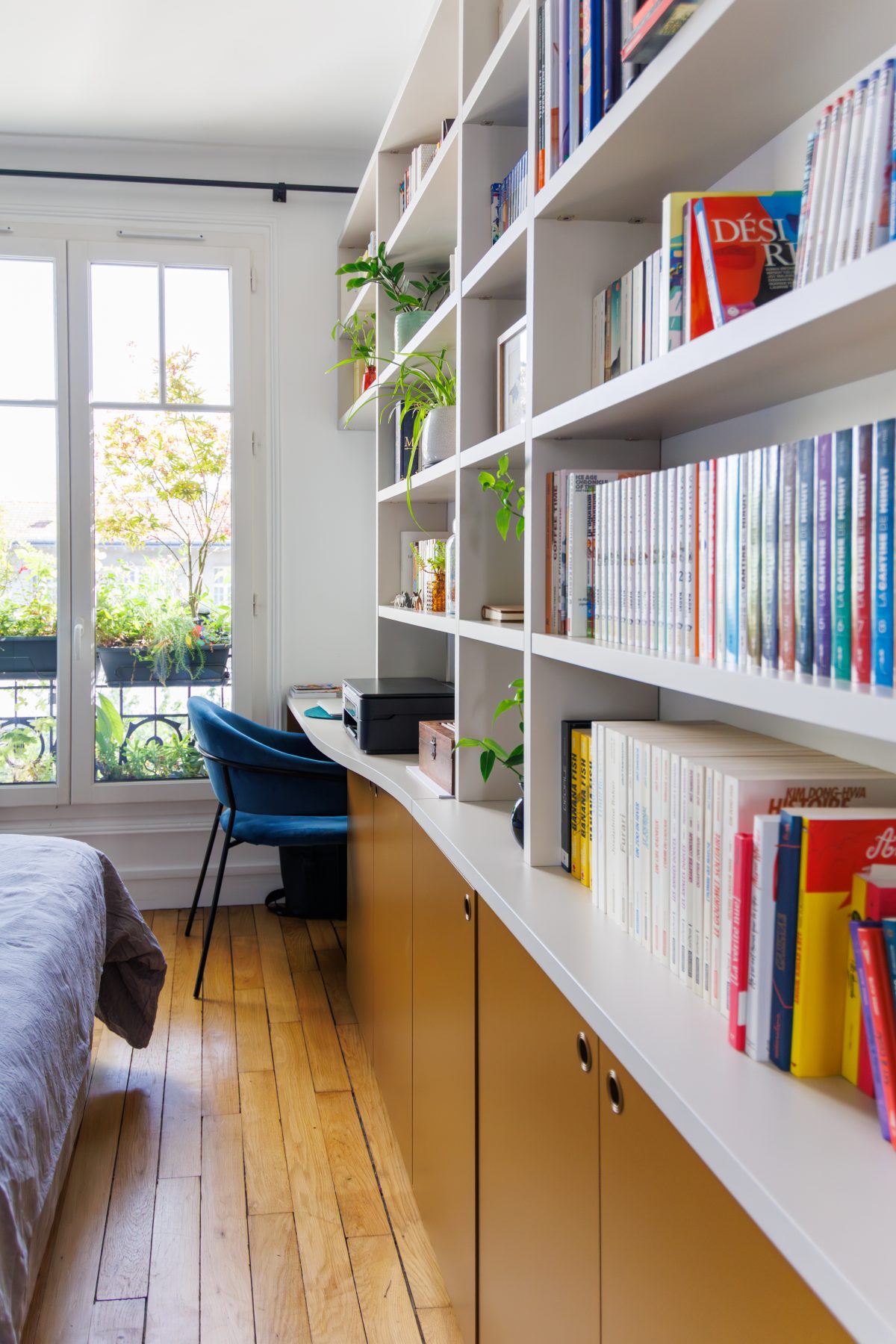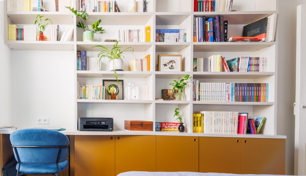 Un espace pensé pour mêler esthétique et fonctionnalité : bibliothèque sur mesure, lumière naturelle, plantes vertes et touches de couleurs.