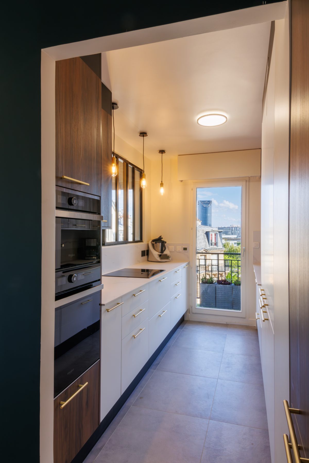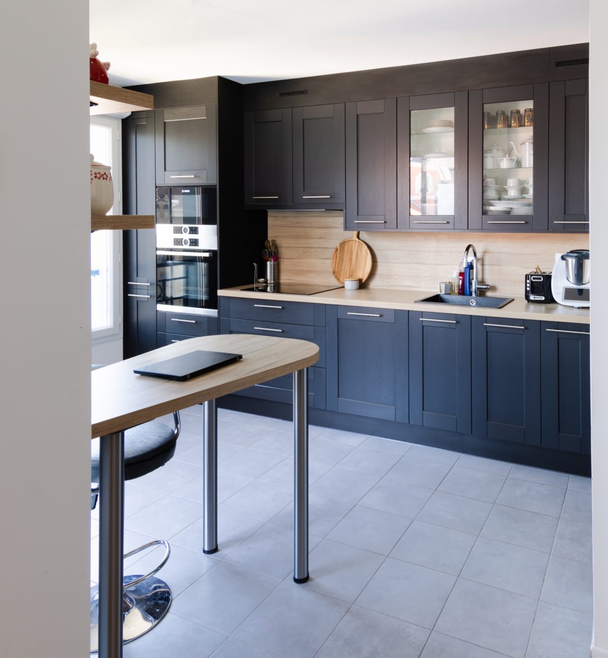 Bienvenue dans cette cuisine contemporaine au charme sophistiqué, où l’élégance du gris anthracite se marie harmonieusement avec la chaleur naturelle du chêne. Les portes aux contours définis, encadrées avec finesse, confèrent à l’espace une esthétique raffinée, alliant modernité et tradition.